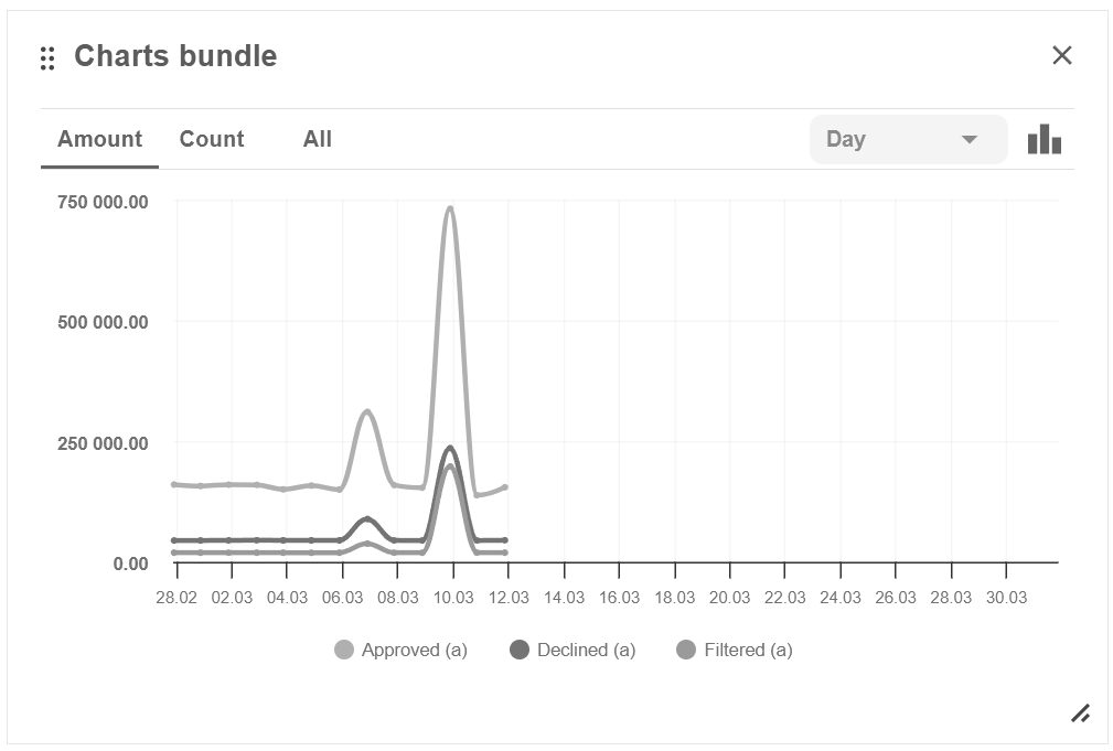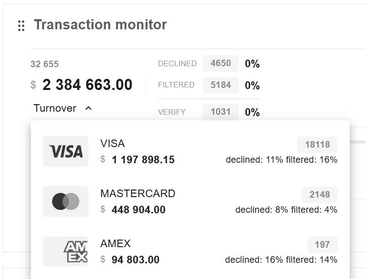 button: the ratio by volume of transactions or by amount of payments, as well as by type of transactions (sale, capture, transfer, etc). Plytech Payment Gateway also displays statistics on negative activity and earnings.