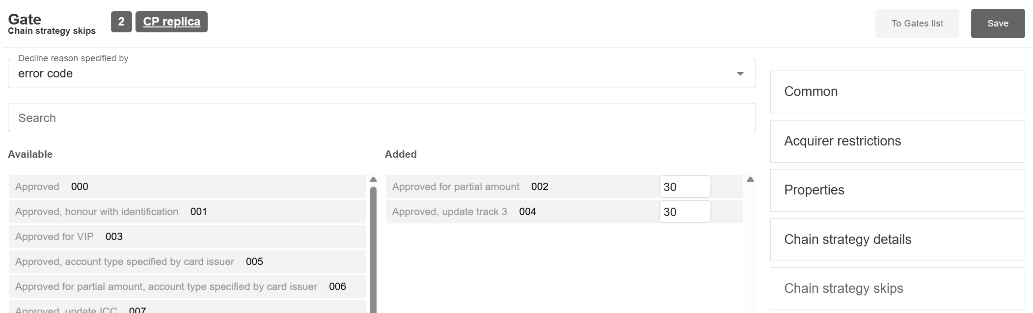 Chain strategy skips allows to skip a gate per PAN for a transaction if one of selected errors codes occur. After transaction is declined for a specific PAN on one gate, this gate will be skipped from cascading on next transactions with the same PAN for the specified time period (set in minutes).