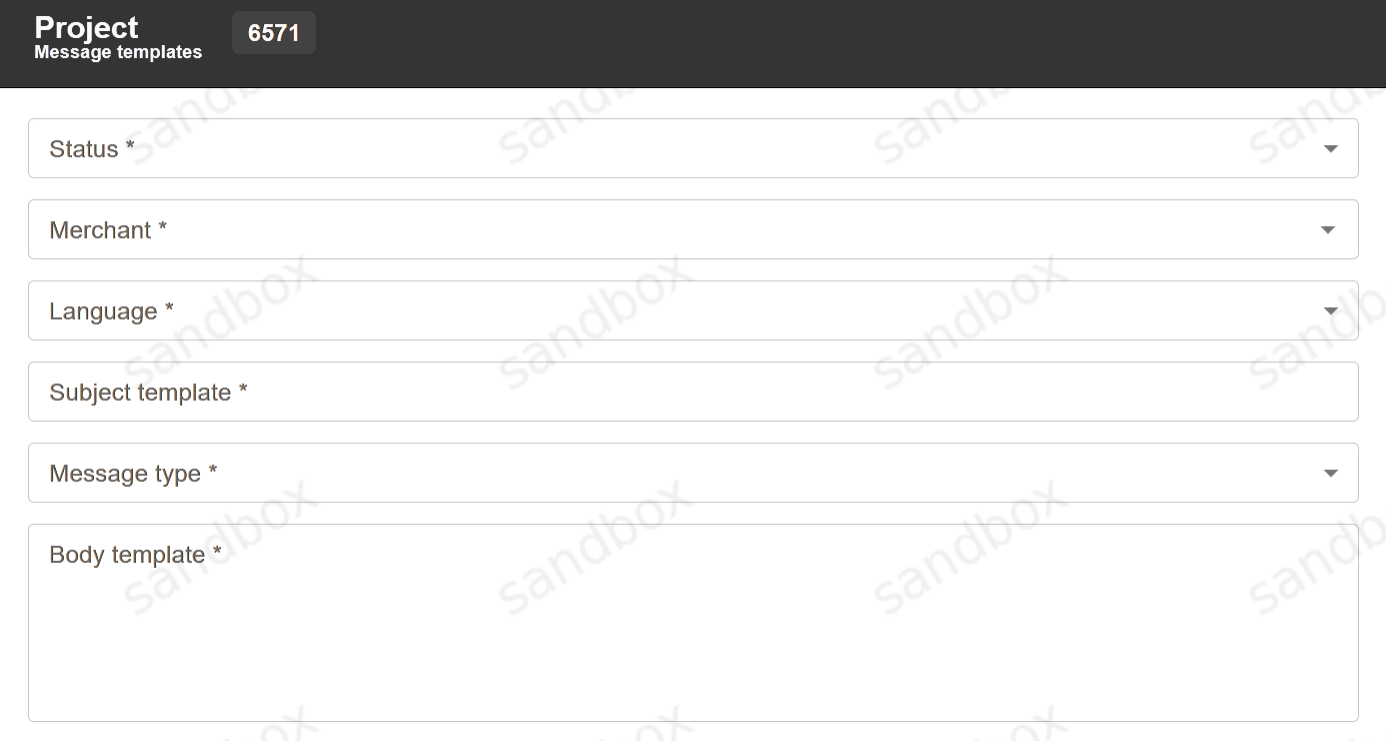 Message templates can be used to send SMS or E-mail messages to customer after each successful transaction. Merchant must provide their message server credentials to Plytech support manager in order to send such messages from merchant address. Templates are created using the Template button. After pressing it, a window with new template details will open: