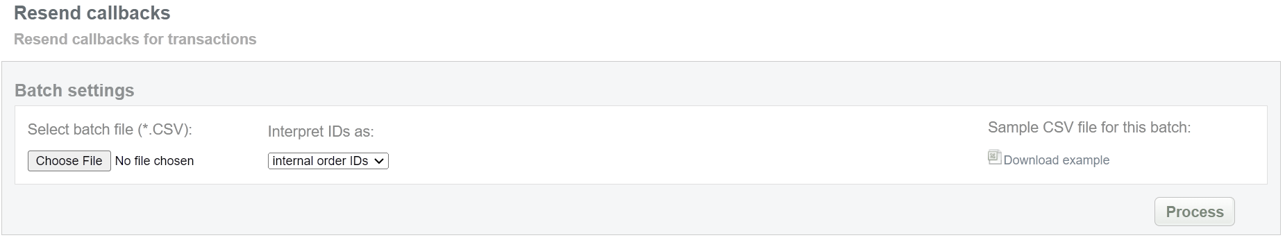 This batch operation can be useful if information on the final status of transactions is available in Plytech system and for some reason is not available in the Connecting Party system. Collect the order IDs, assigned by Plytech system to the CSV file and upload it to send new callback notifications. An example of CSV file for upload is available on the same screen.