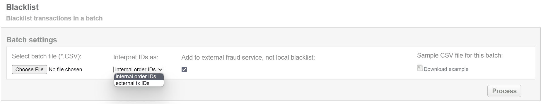 This batch operation, in according to specified input, puts cards in blacklist or external fraud system if such is set up. Collect the order IDs, assigned by Plytech system to the CSV file and upload it to blacklist card of selected transactions. An example of CSV file for upload is available on the same screen.