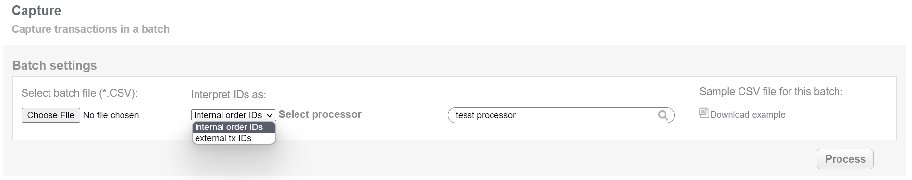 This batch operation can be useful for deducting the locked amount from preauth transactions (preauth should be in approved final status) in according to specified input. Collect the order IDs, assigned by Plytech system to the CSV file and upload it to make capture of selected transactions. An example of CSV file for upload is available on the same screen.