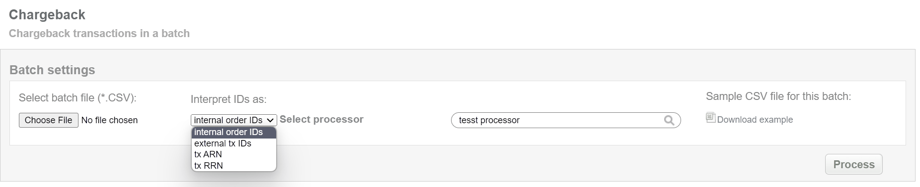 This batch operation can be useful if for some reason reversal was not made to prevent a chargeback and creating chargeback transaction according to specified input is needed. Collect the order IDs, assigned by Plytech system to the CSV file and upload it to make chargebacks for selected transactions. An example of CSV file for upload is available on the same screen.