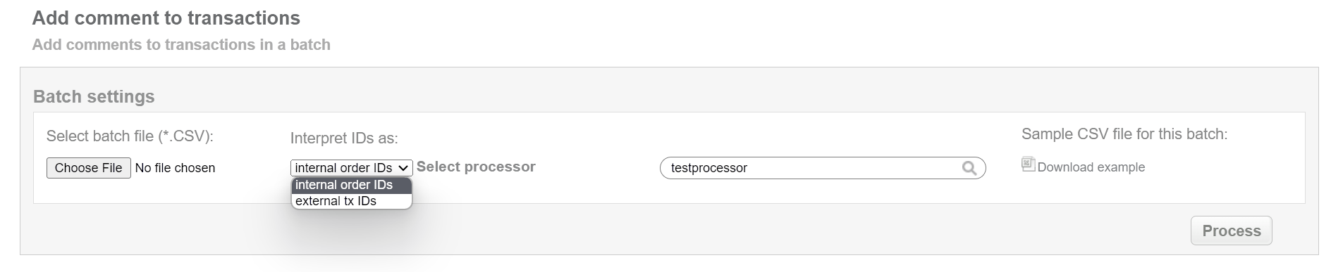 This batch operation can be useful for adding a or an additional comment to transactions in according to specified input. Collect the order IDs, assigned by Plytech system to the CSV file and upload it to add comment for the selected transactions. An example of CSV file for upload is available on the same screen.