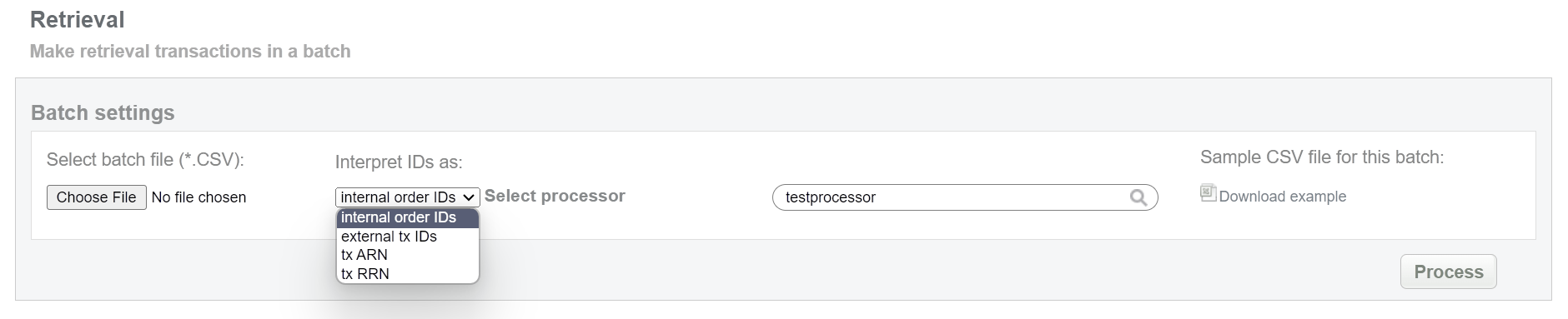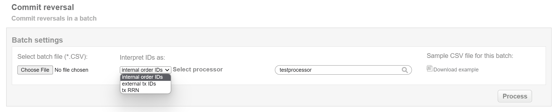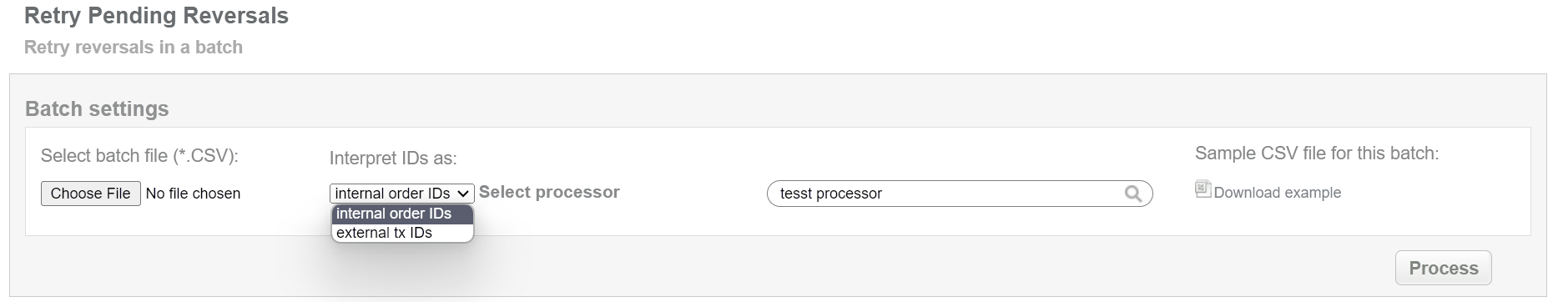 This batch operation re-sends reversal request for pending reversals in according to specified input. Collect the order IDs, assigned by Plytech system to the CSV file and upload it to make reversal of selected transactions. An example of CSV file for upload is available on the same screen.