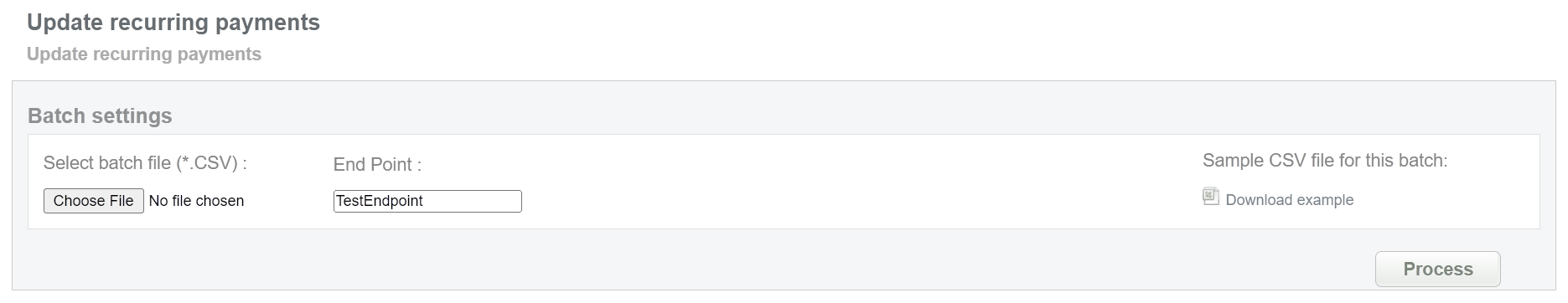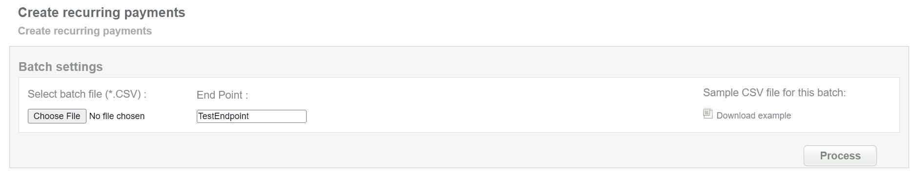 This batch operation can be useful for initiating recurring payments for transactions that require regular debits with the same data. Collect the order IDs, assigned by Plytech system and enter all information to the CSV file and upload it to create recurring payments. An example of CSV file for upload is available on the same screen.