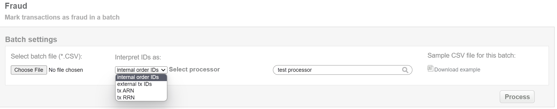 If Connecting Party suspects transaction to be fraudulent, then this batch operation can be useful for marking transactions as fraud in according to specified input. Collect the order IDs, assigned by Plytech system to the CSV file and upload it to mark selected transactions as fraud. An example of CSV file for upload is available on the same screen.