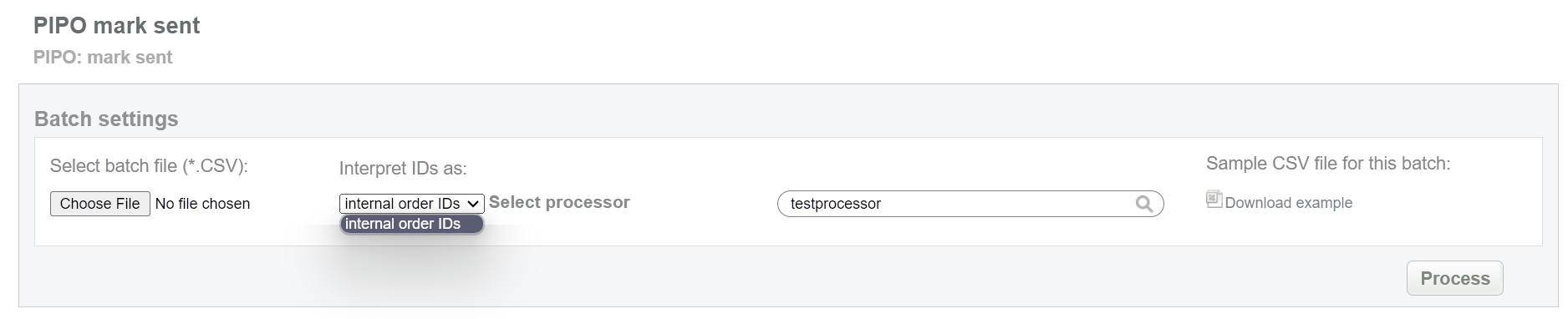This batch operation allows to mark pending bank transfer as sent (but not received yet). This status equals to “processing” for preauth transaction. Collect order IDs, assigned by Plytech system and enter all information to the CSV file and upload it to mark PIPO payments as sent. An example of CSV file for upload is available on the same screen.