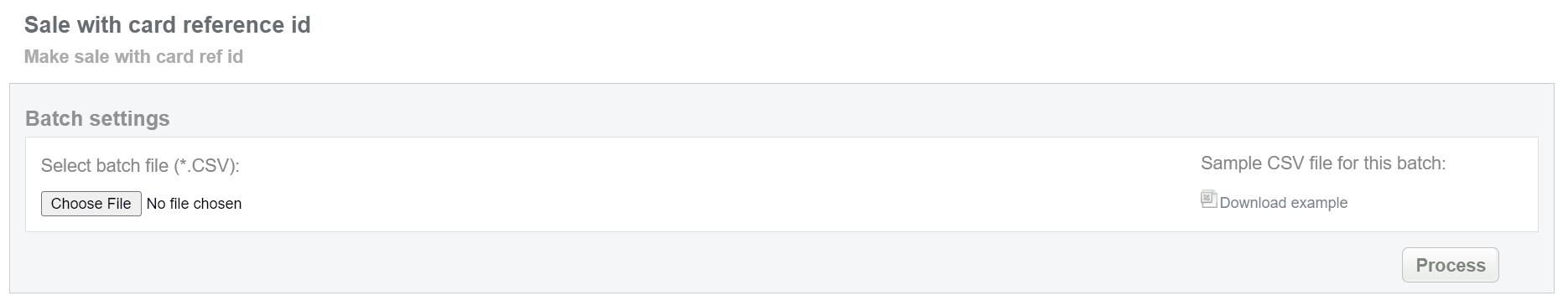 This batch operation can be useful for initiating sale without any card information using only card reference ID. Collect the Endpoint and Card reference IDs, assigned by Plytech system and enter all information to the CSV file and upload it to initiate sale transactions with card reference ID. An example of CSV file for upload is available on the same screen.