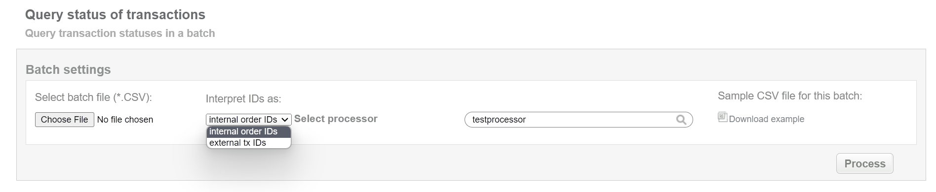 This batch operation can be useful for requesting status of transactions (doesn’t matter in what status) in according to specified input. Collect the order IDs, assigned by Plytech system to the CSV file and upload it to request status of the selected transactions. An example of CSV file for upload is available on the same screen.