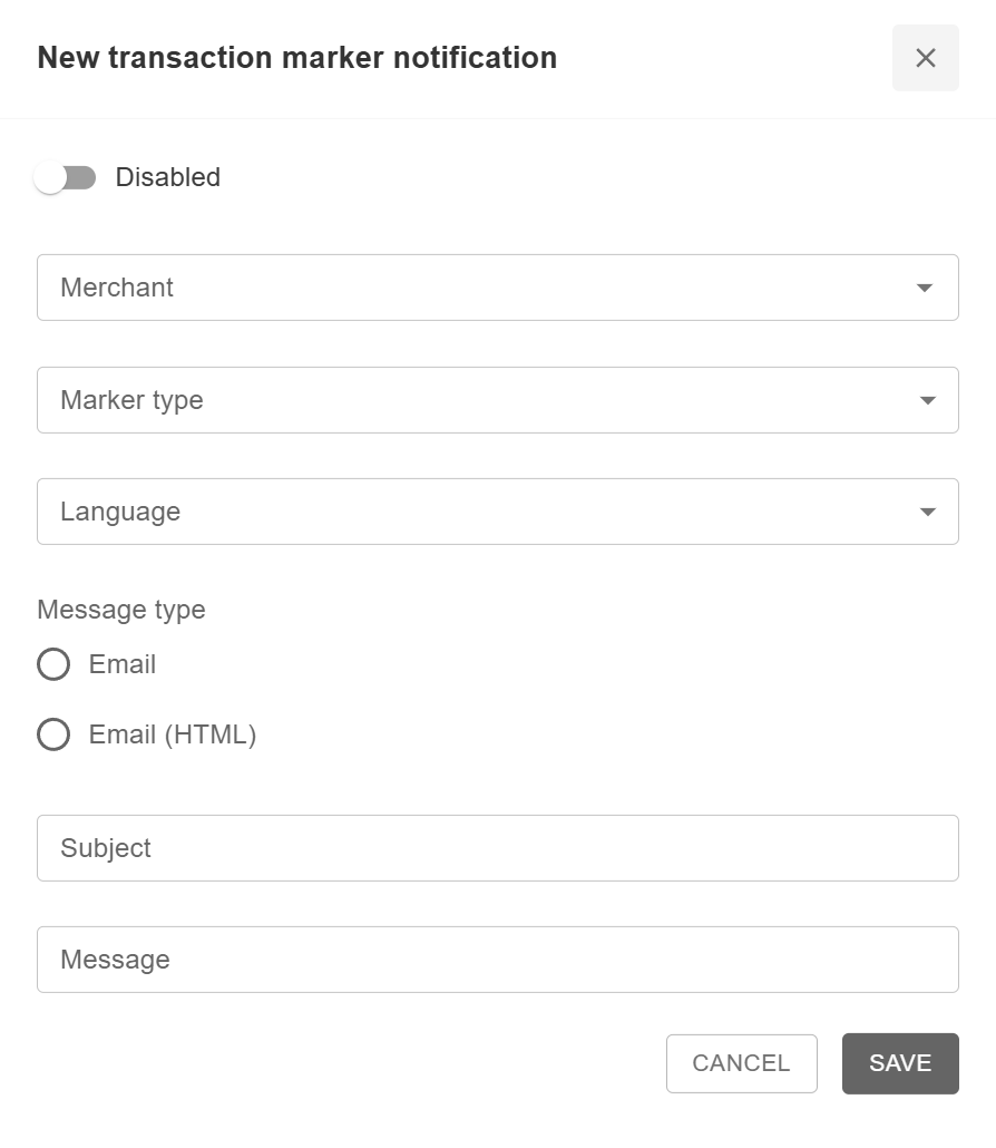 The Transaction marker notification tool is used to notify users about specific issues that might happen to transactions and usually require quick response. Each time the specified transaction marker is triggered, it will send email notification to user’s email address. For example, if notifications for chargebacks are enabled, user will get a new email notification for each chargeback applied to a processed transaction. Email content can be customized.