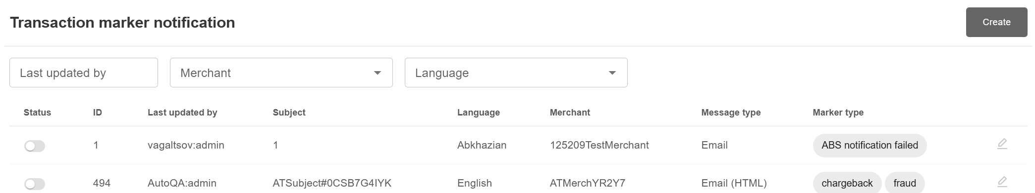 The main screen displays a list of all notifications, their status, ID, subject, language, merchant name, message type and marker type.