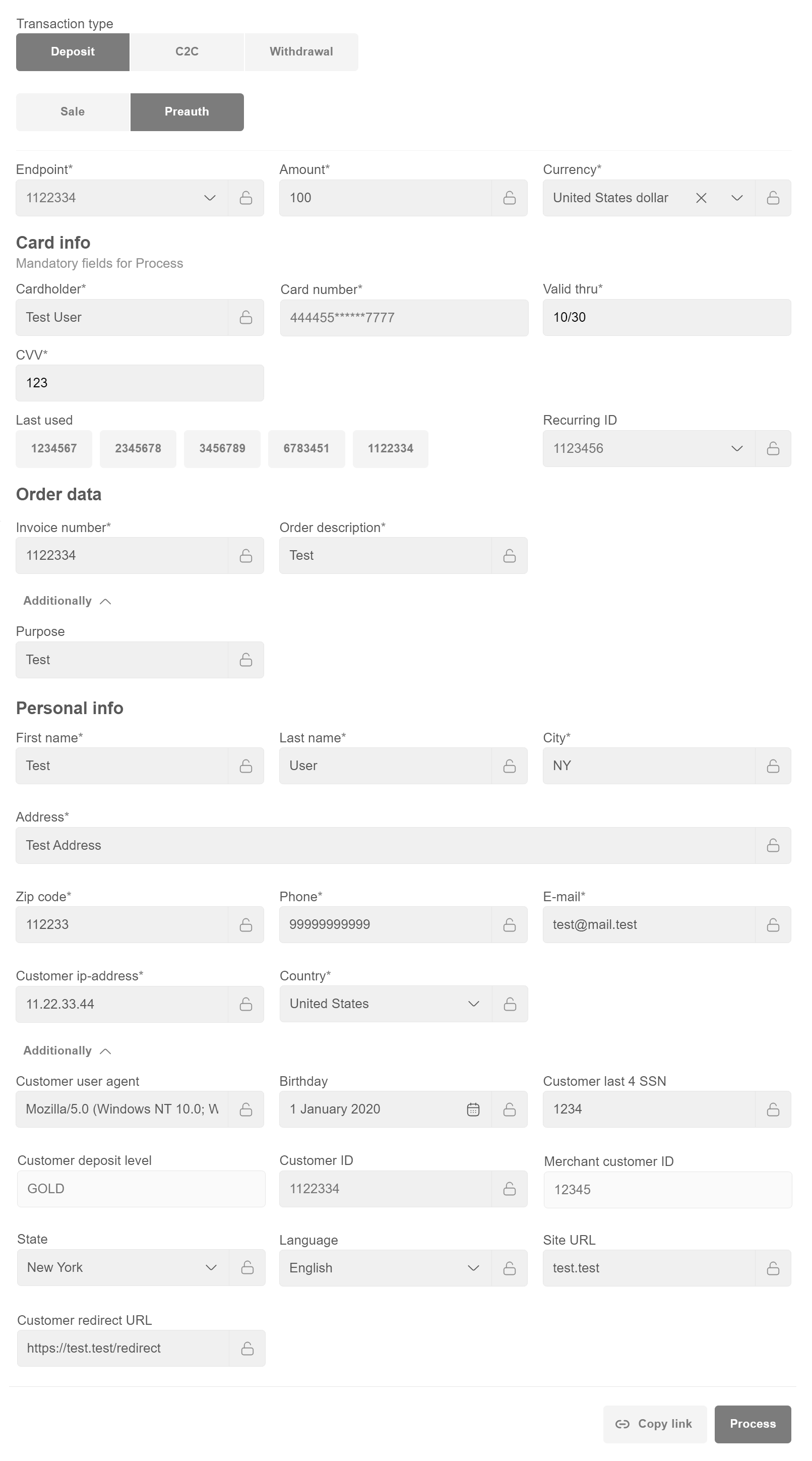 When filling in the Customer ID field, Personal info (First name, Last name,City, Address, Zip code, Phone, E-mail, Country) sections will be filled in automatically.