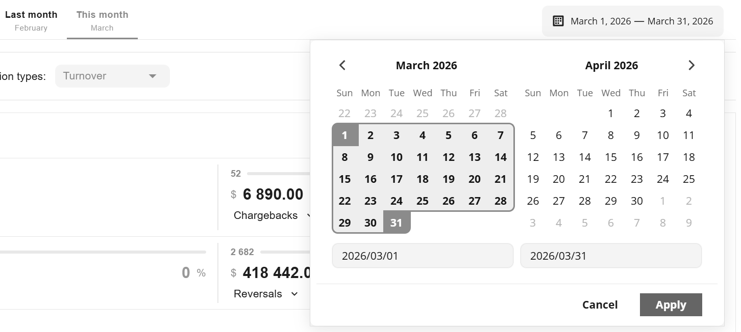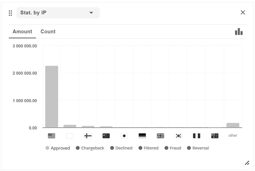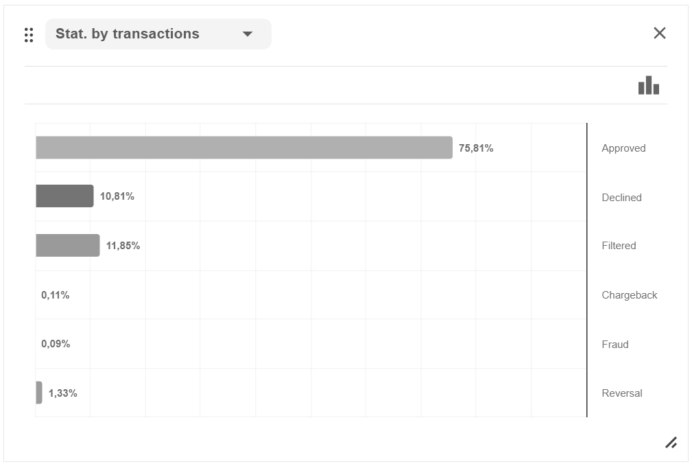 button: the ratio by volume of transactions or by amount of payments, as well as by type of transactions (sale, capture, transfer, etc). Plytech Payment Gateway also displays statistics on negative activity and earnings.