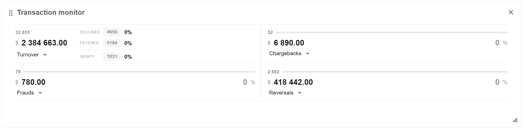 The sum of all successful sale, capture, reversal (refund) and transfer operations |