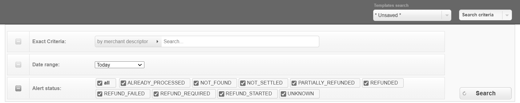 Select one or more search criteria and click Search to find the needed transactions.