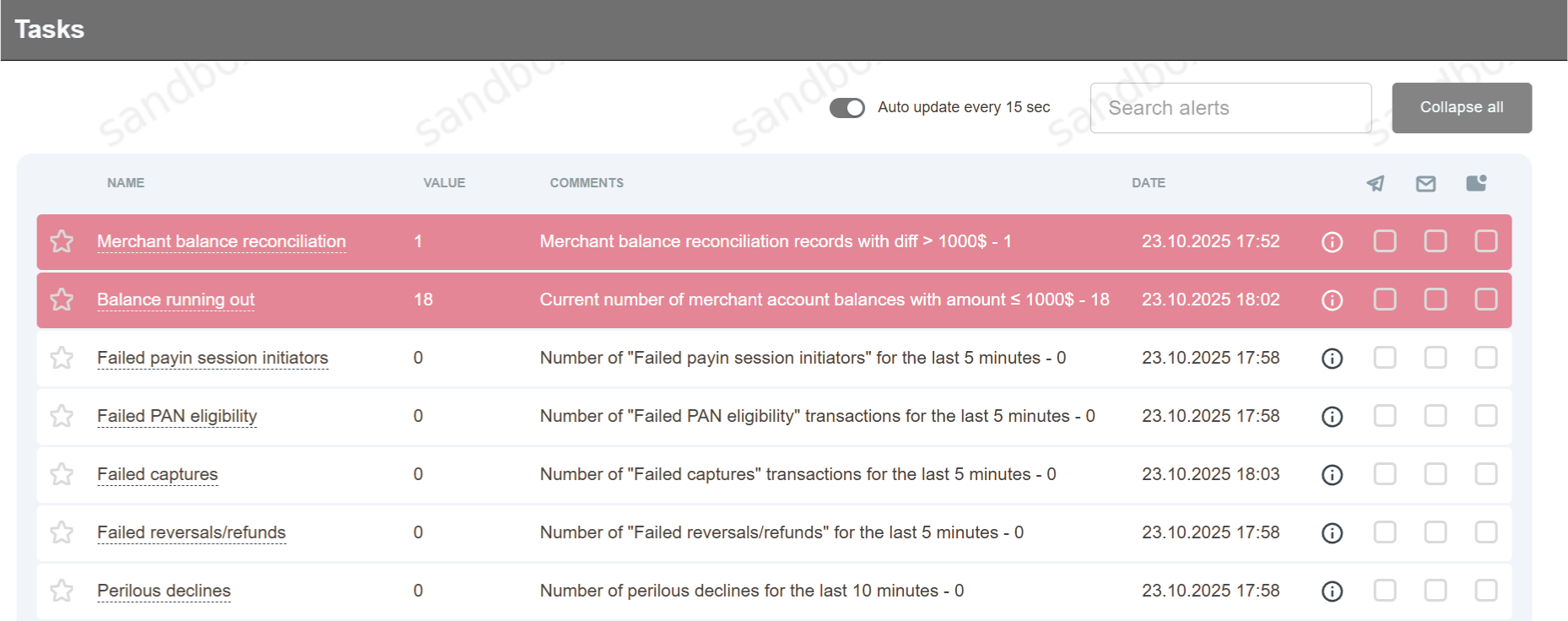 The screen is located in “Tools” – “Monitoring” section. This screen displays information about various errors that usually require quick response, as well as the options to subscribe for notifications about any errors via Telegram, Email or Push notification. Phone number and e-mail address are taken from the personal account (Merchant or its employee account).